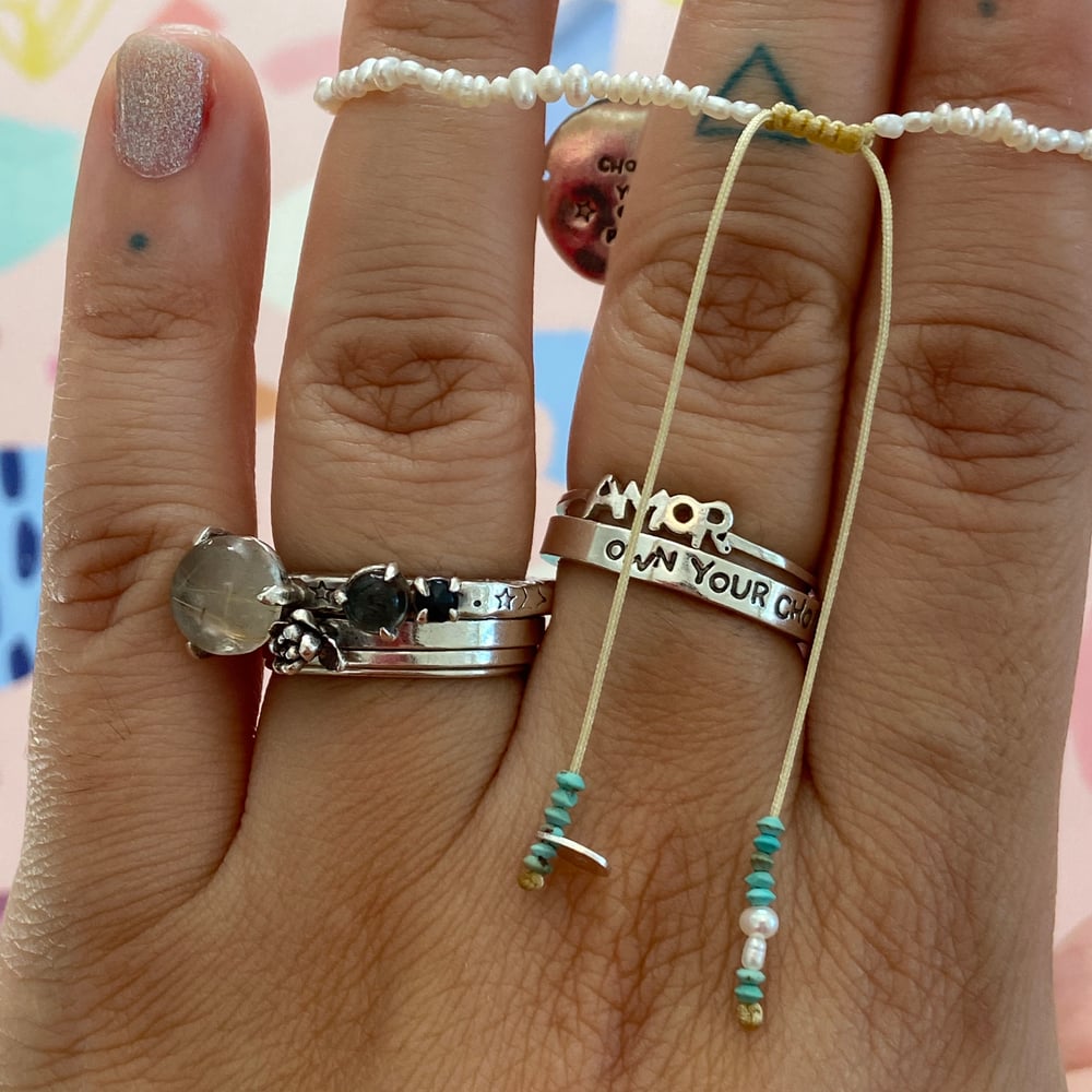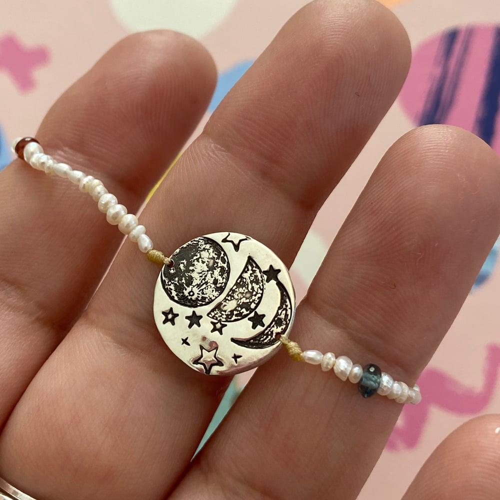 Made in sterling silver, pearls, turquoise, aquamarine and garnet stones.
