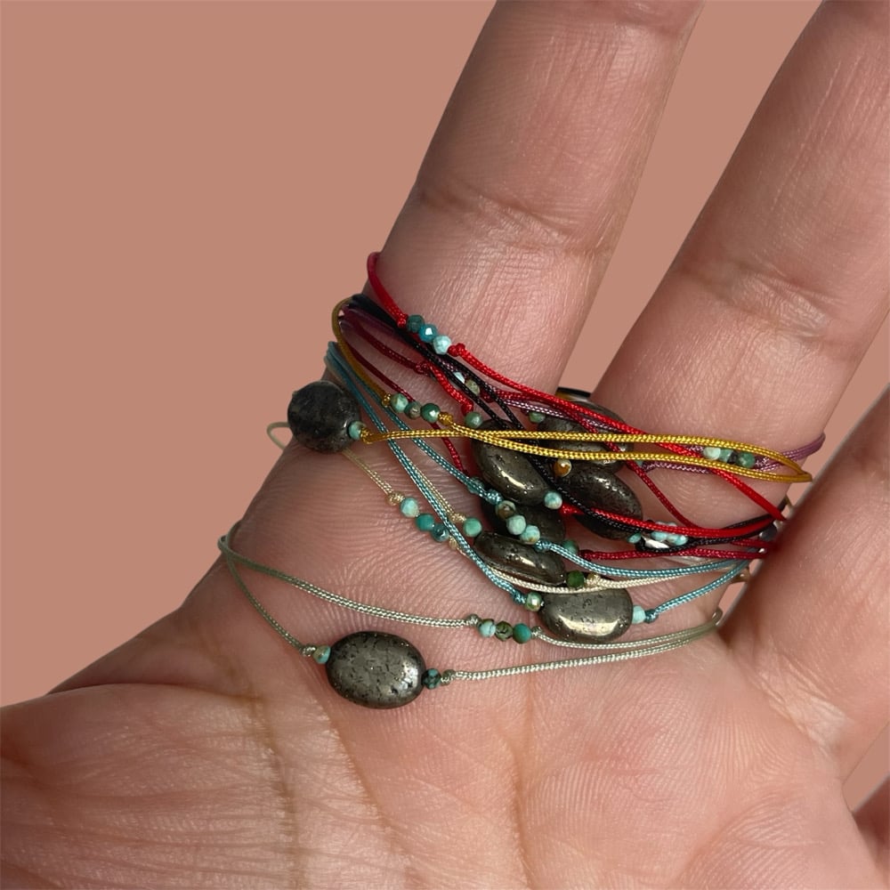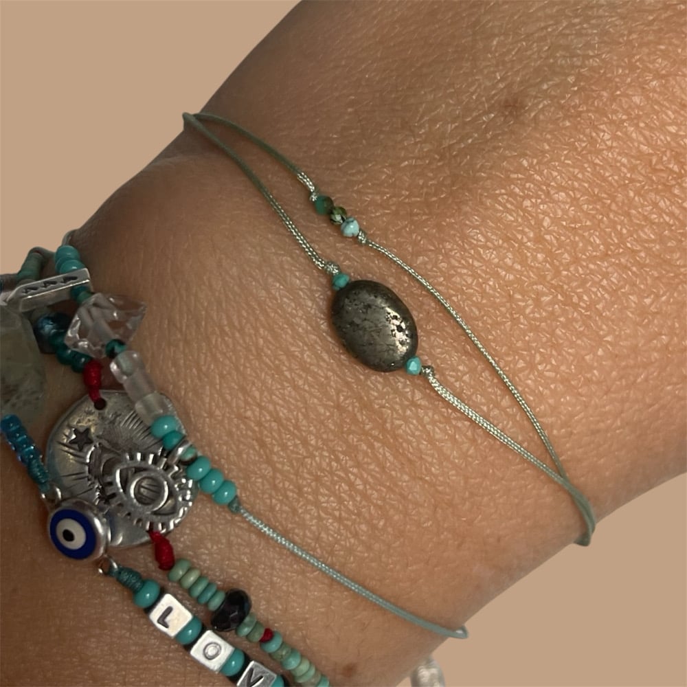 Made with natural turquoise and pyrite. Seed beads at the end of the bracelet.