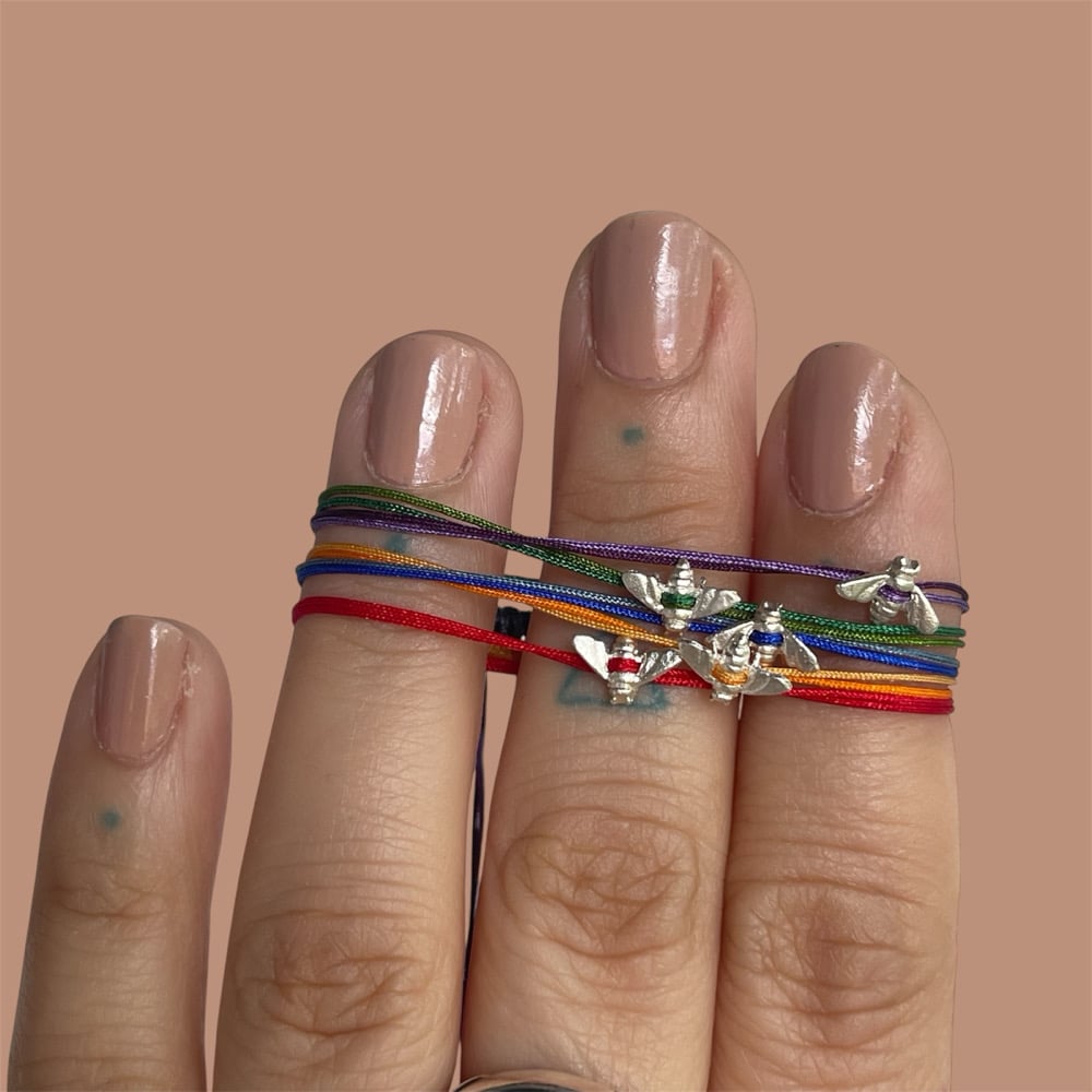 Made with sterling silver bee, string and seed beads at the end of the bracelet.