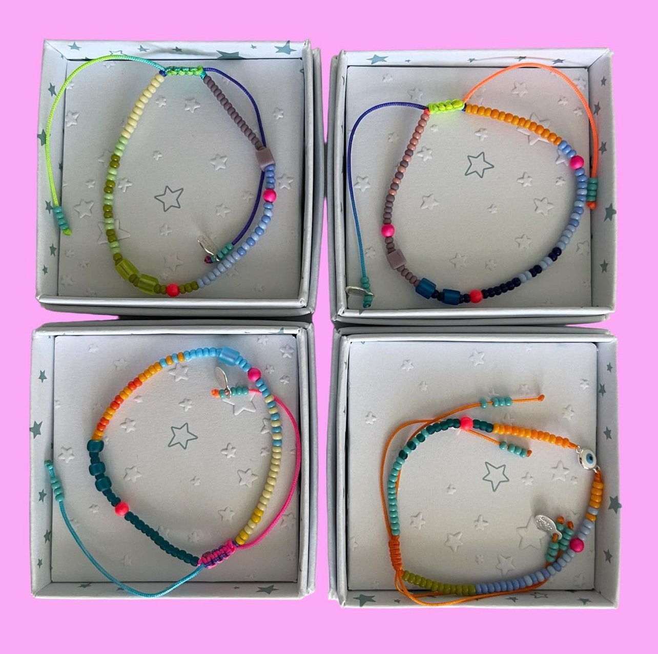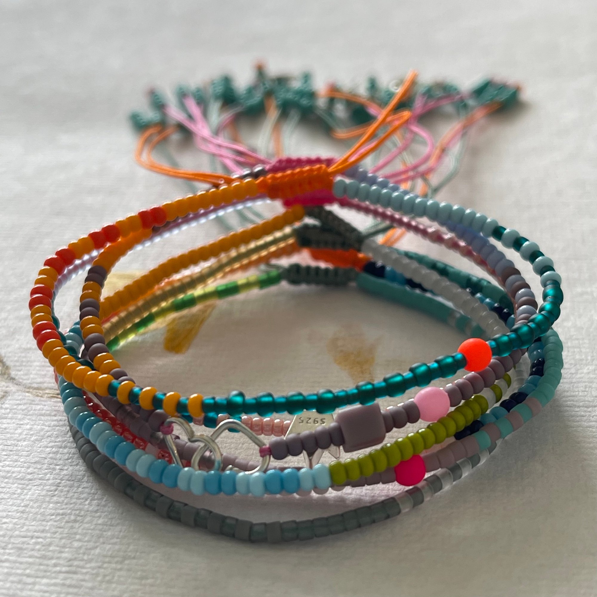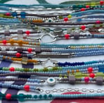 Made with colorful seed beads and string.