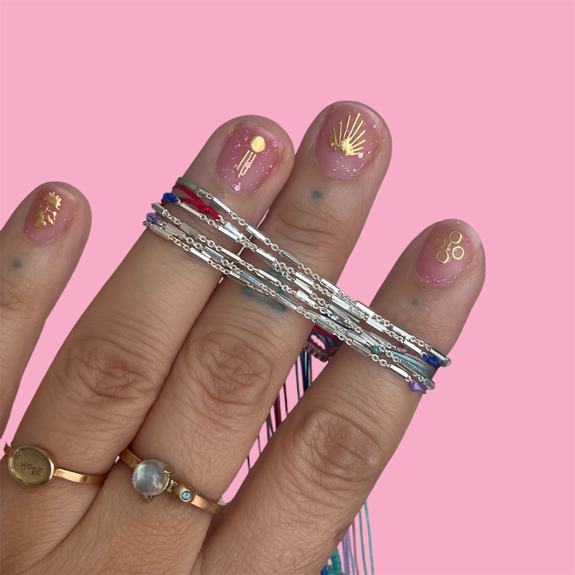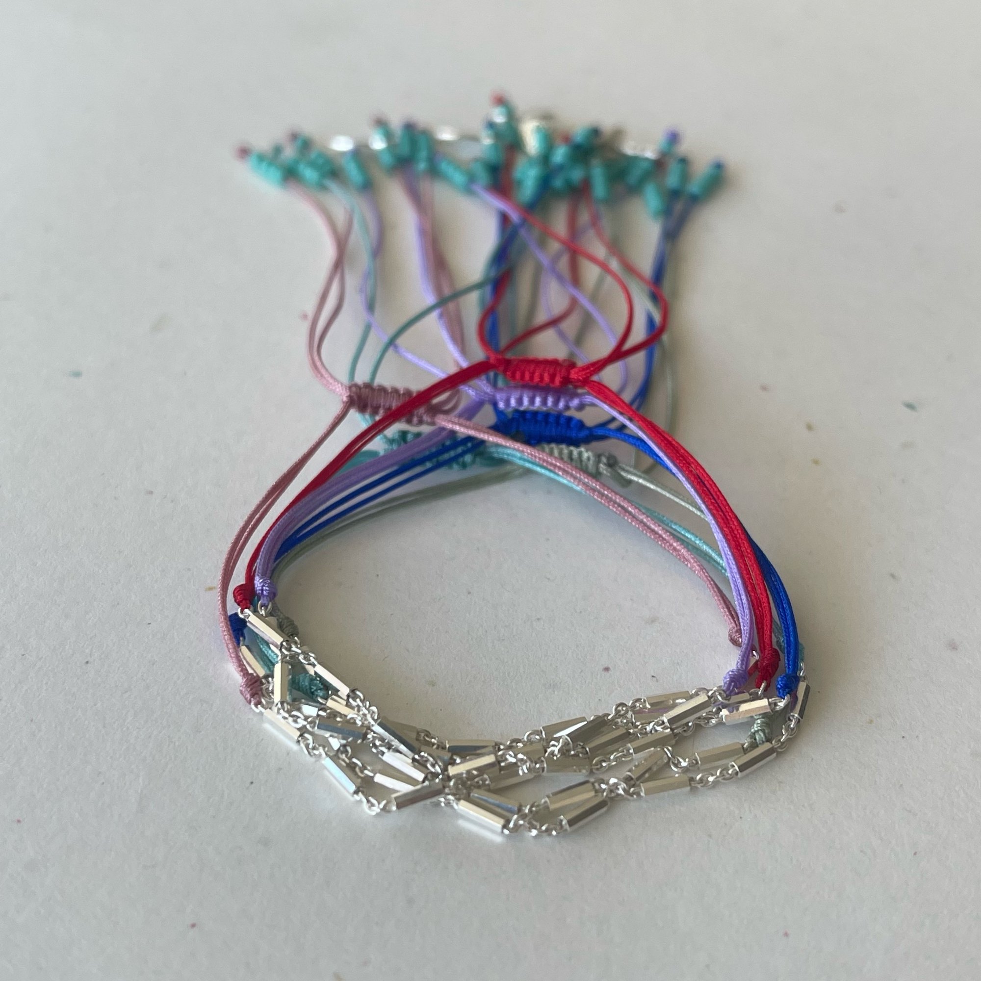 This bracelet is made with double thread, seed beads, sterling silver chain and a macrame closure to adjust any size.