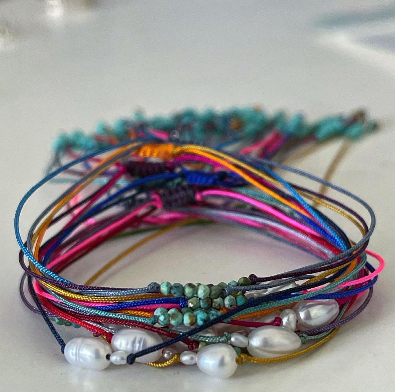 Made with natural turquoise and pearls. Seed beads at the end of the bracelet.